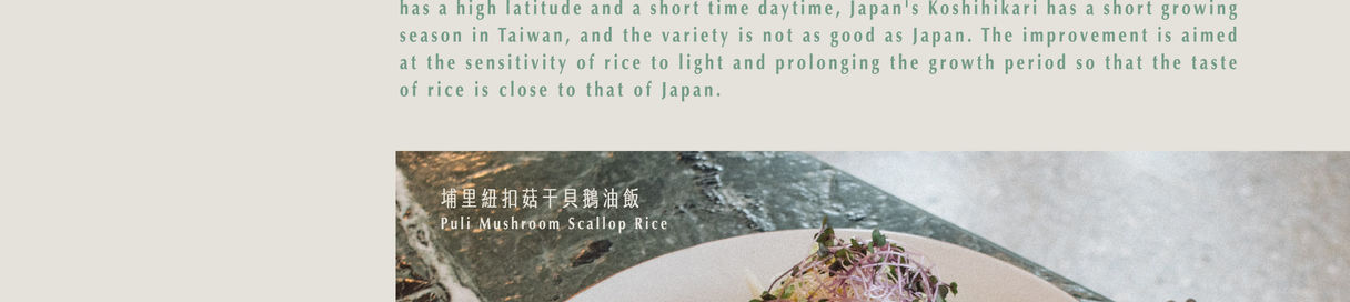 選用的臺南後壁越光米 コシヒカリ,是與臺灣大學技術合作所改良的日本越光米種,擁有96%日本越光米種DNA。因為日本緯度較高、日照較短,所以日本越光米在臺灣日照較長的耕種環境下,導致生長期縮短,品種不若日本種好。改良針對稻米對光線的敏感度、延長生育期,讓米飯口感接近日本產的越光米品質。